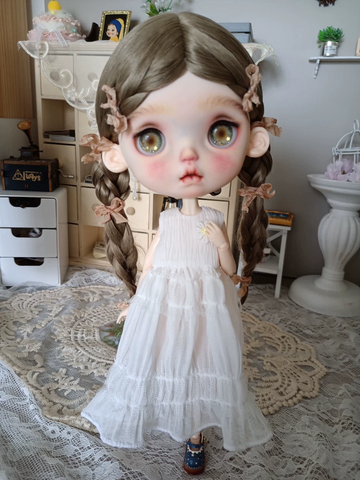 Elegant White Floral BLYTHE Doll Dress with Ruffles & Blue Shoes – Premium Quality for Dynamic Posing
