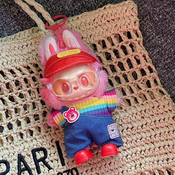 Vibrant LABUBU Rainbow Outfit: Plush Sweater, Denim Overalls & Accessories for Collectible Dolls