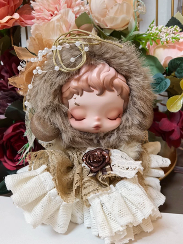 Whimsical Skullpanda Doll Outfit: Lace Dress & Faux Fur Hood – Elegant Collectible for Enthusiasts