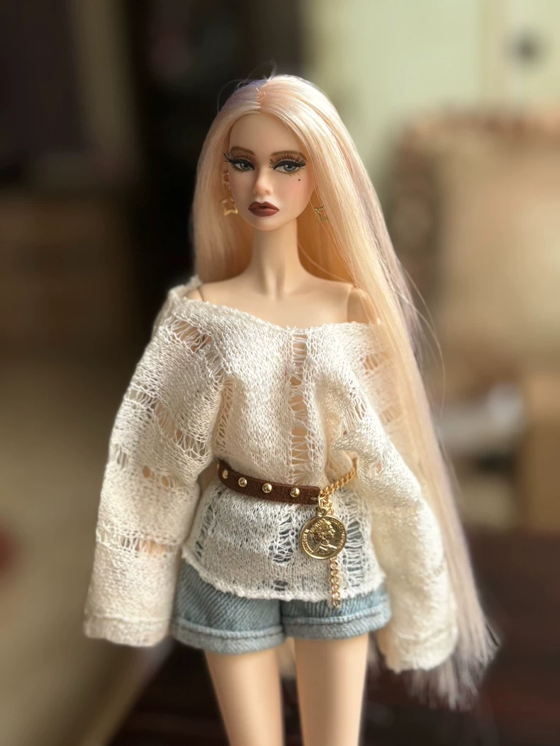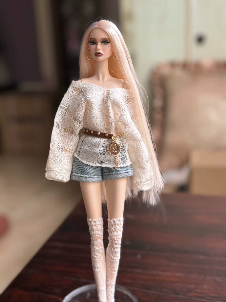 Blythe Doll Outfit Set: Cozy Knit Sweater, Denim Shorts, Belt & Lace Socks for Barbie Mezco Dream