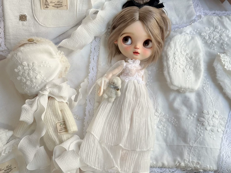 Elegant Blythe Doll Set: Delicate White Dress, Cozy Swaddle Bag & Charming Face Mask for Imaginative Play
