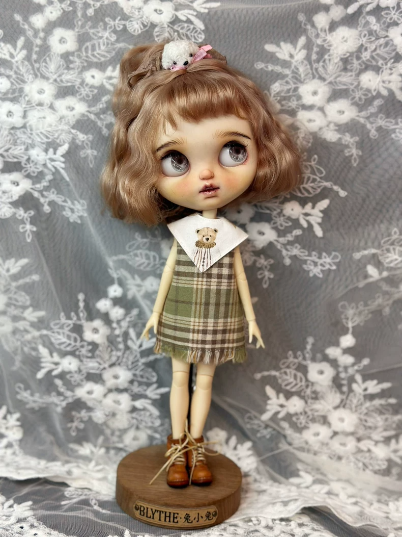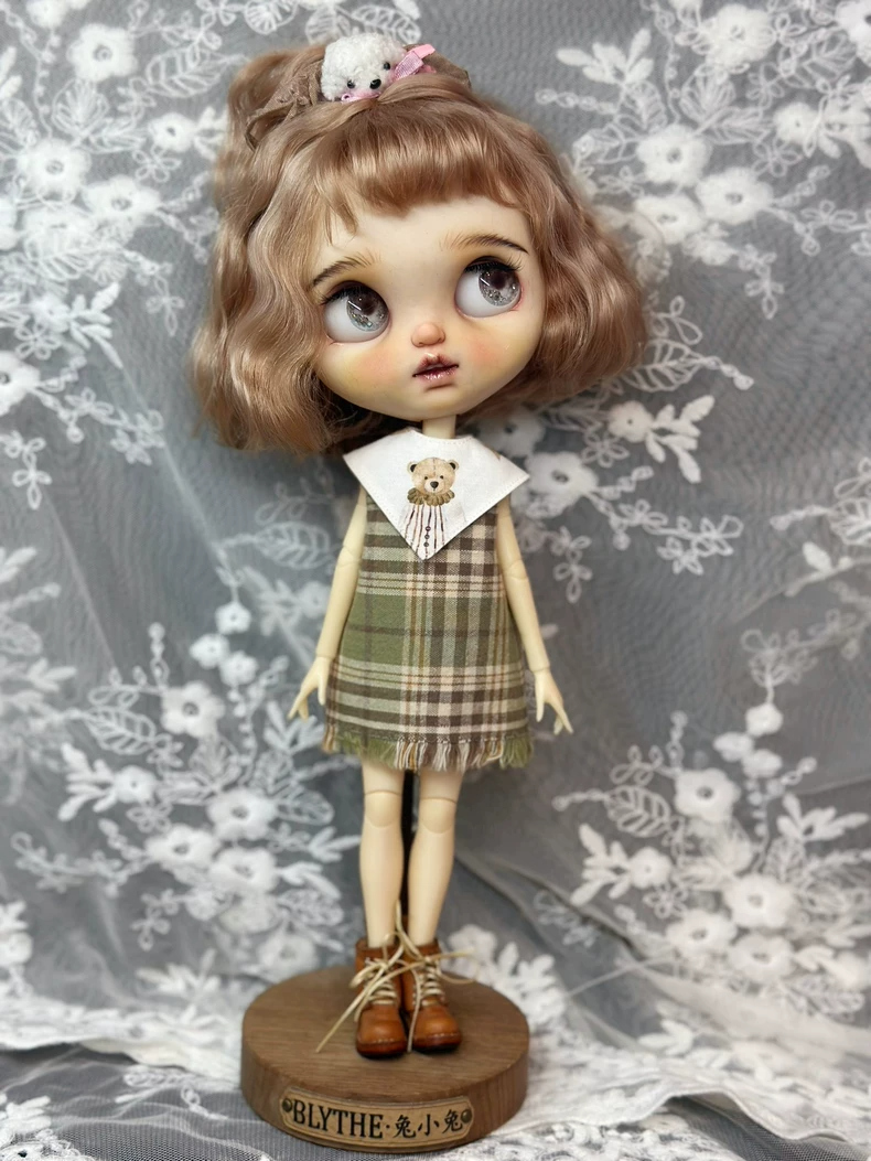 Charming Blythe Doll Plaid Dress Outfit with Teddy Bear Collar & Boots