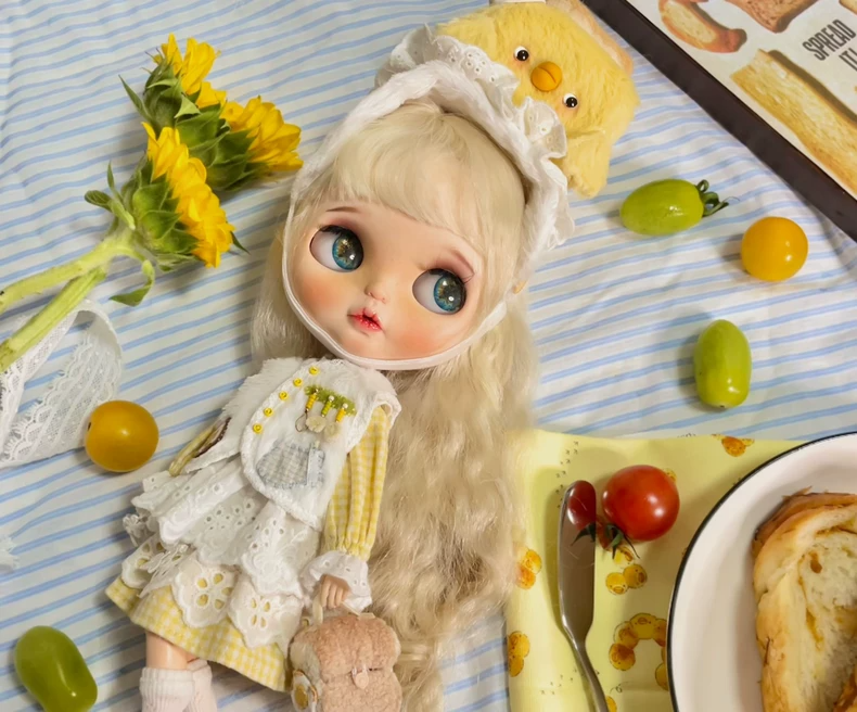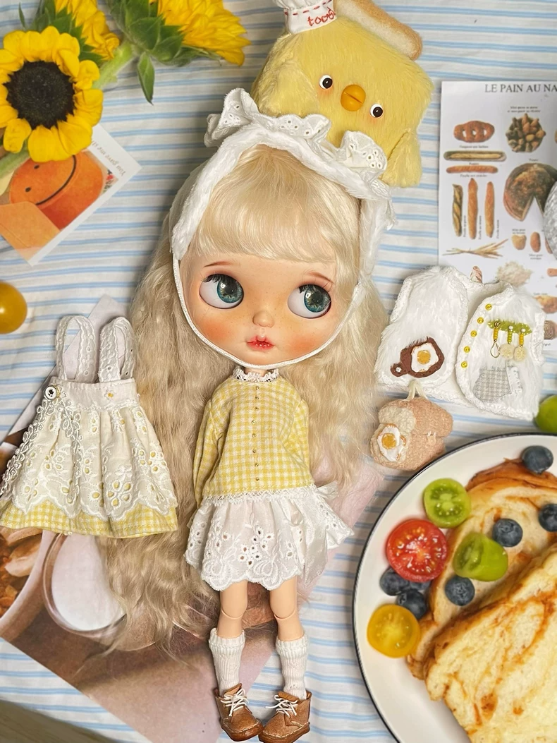 Charming Culinary Blythe Doll Outfit – Yellow Gingham Apron Dress, Hat & Accessories for OB22/OB24