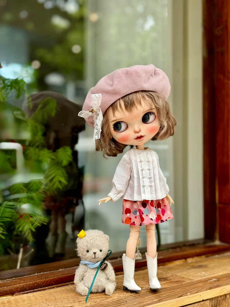Charming French Blythe Doll Outfit: Strawberry Skirt & Beret – Elegant & Whimsical