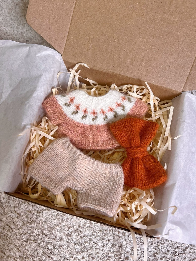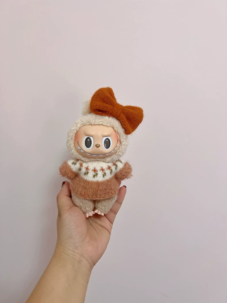 Charming Labubu Doll Outfit: Handcrafted Knitted Sweater & Pants with Floral Patterns & Orange Bow