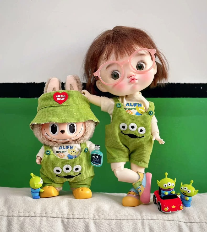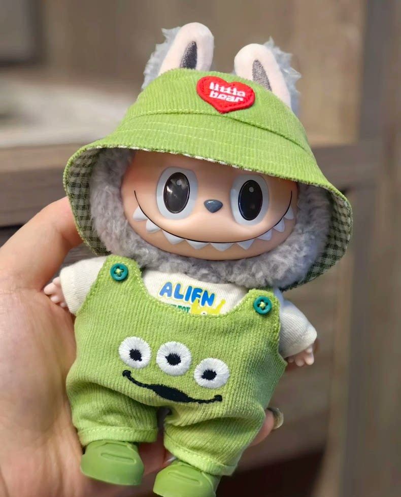 Charming LABUBU Doll Outfit Set: Green Corduroy Hat, Shirt & Overalls for 17cm Dolls – Handmade & Whimsical