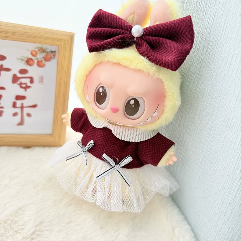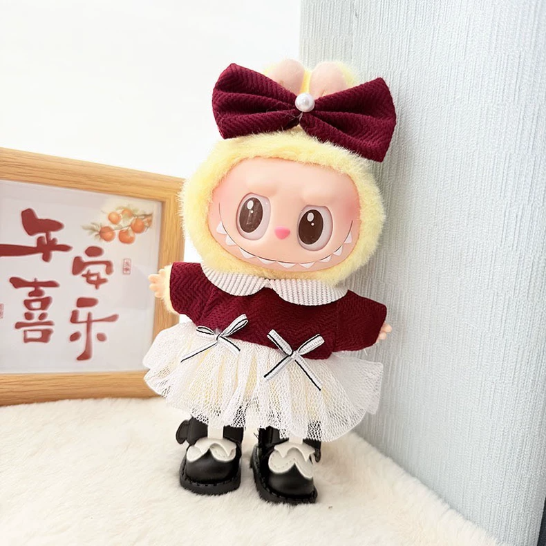 Charming Labubu Doll Outfit - Wine Red & White Dress with Bows & Matching Shoes for Collectors