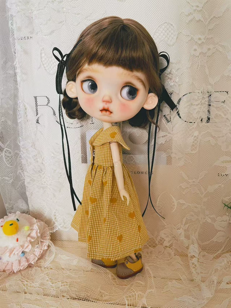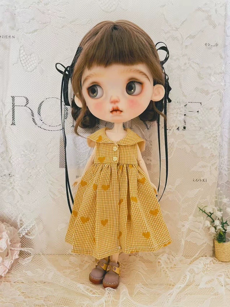 Charming Yellow Checkered Blythe Doll Dress with Heart Patterns & Matching Accessories – OB22/OB24