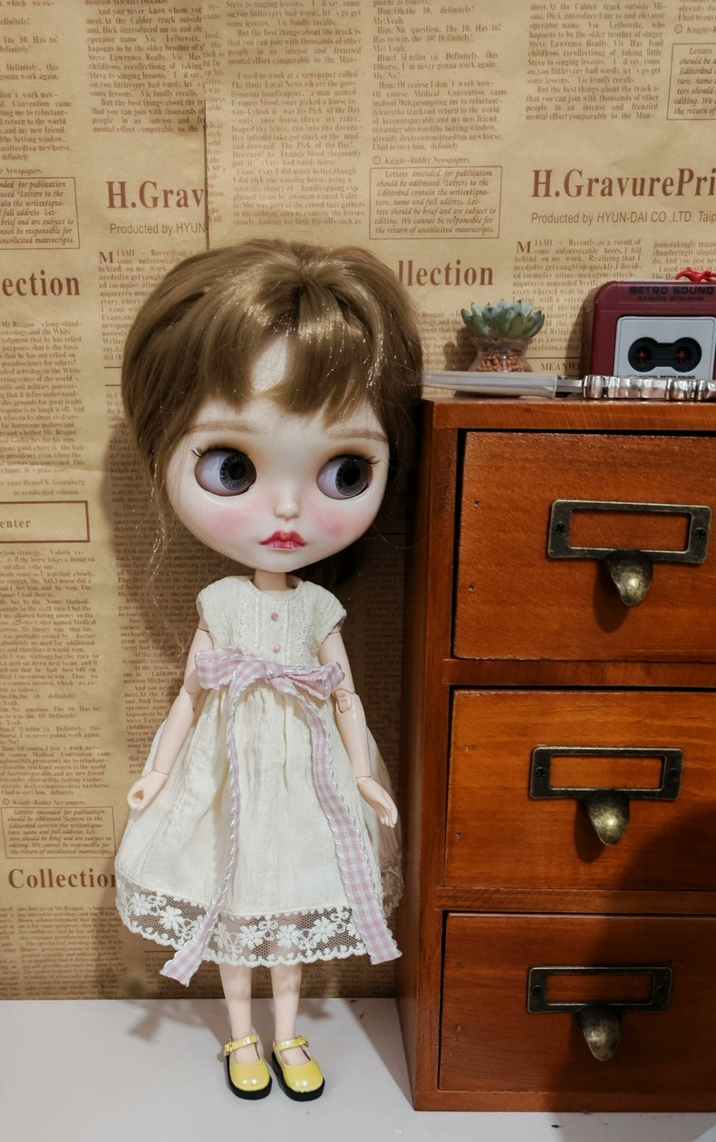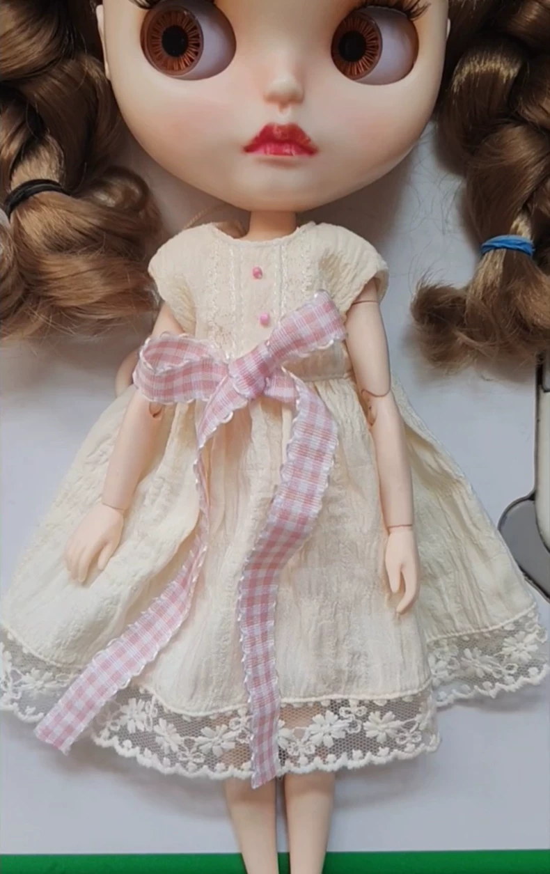 Vintage Cream Lace Dress with Pink Gingham Bow & Yellow Shoes for BLYTHE OB24 OB22 A-ZONE Dolls - No Returns