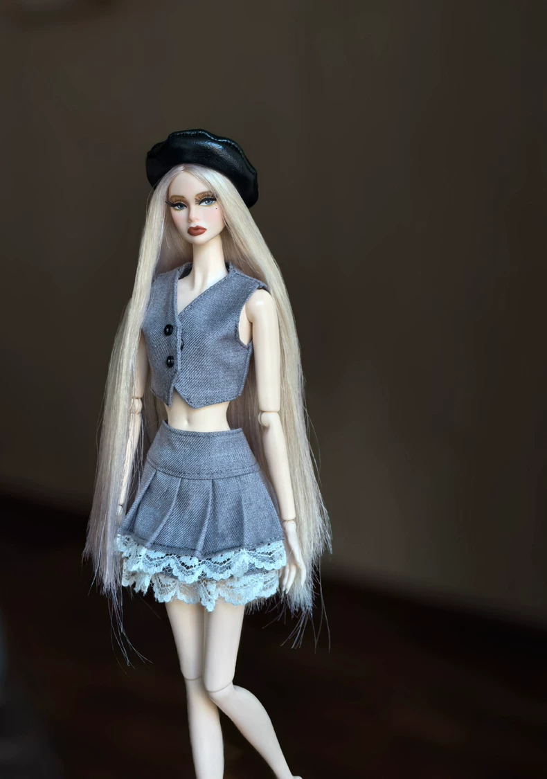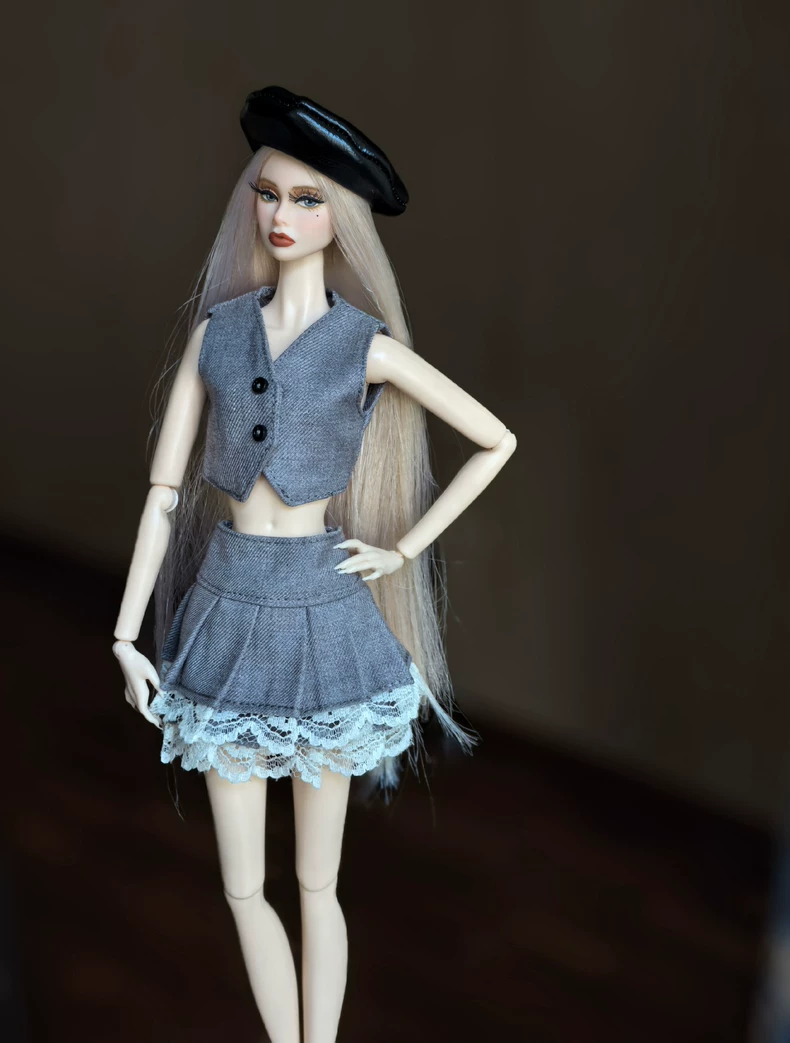 Elegant Gray & White BJD 1/6 Doll Outfit – Vest, Skirt, Hat Set for Barbie & More | High-Quality Fashion