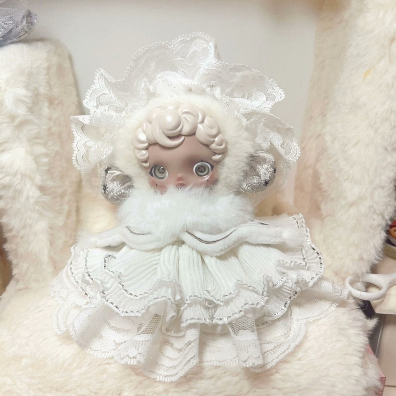 Elegant Skullpanda Lace Dress with Faux Fur Collar – Collectible Doll Outfit