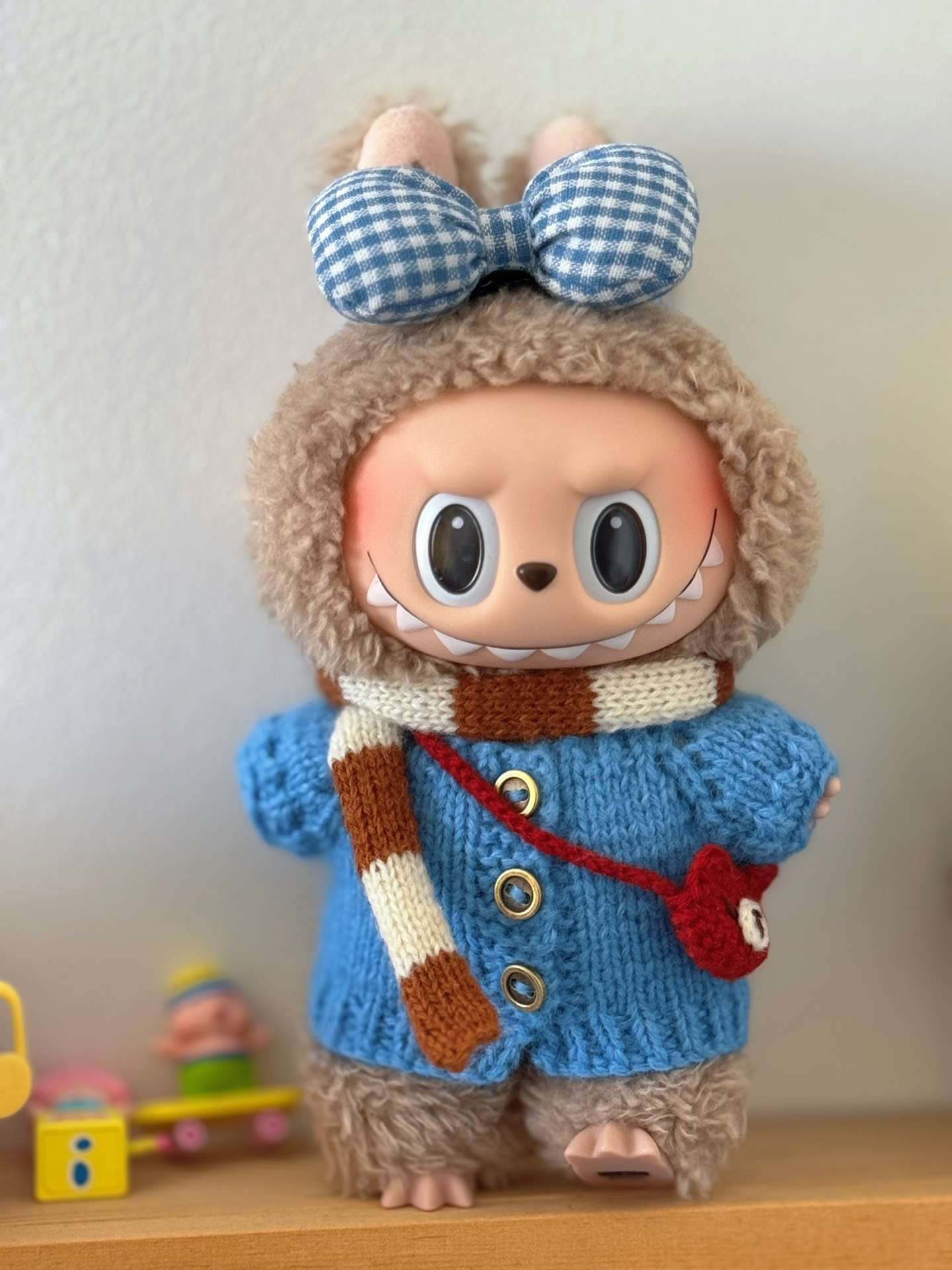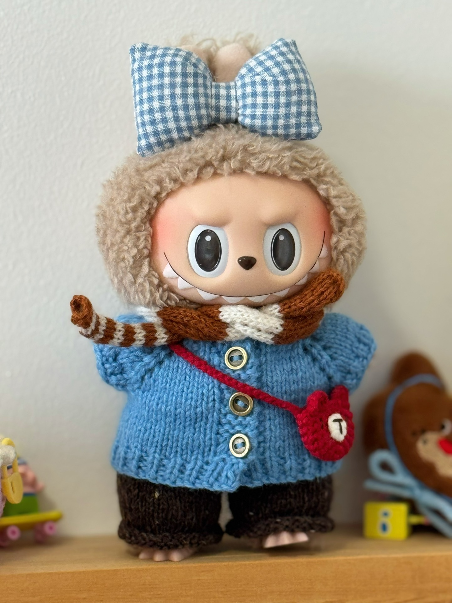Handmade Knit Labubu Doll Outfit: Cozy Blue Sweater, Scarf & Headband – Perfect for Collectors & Playful Fashion