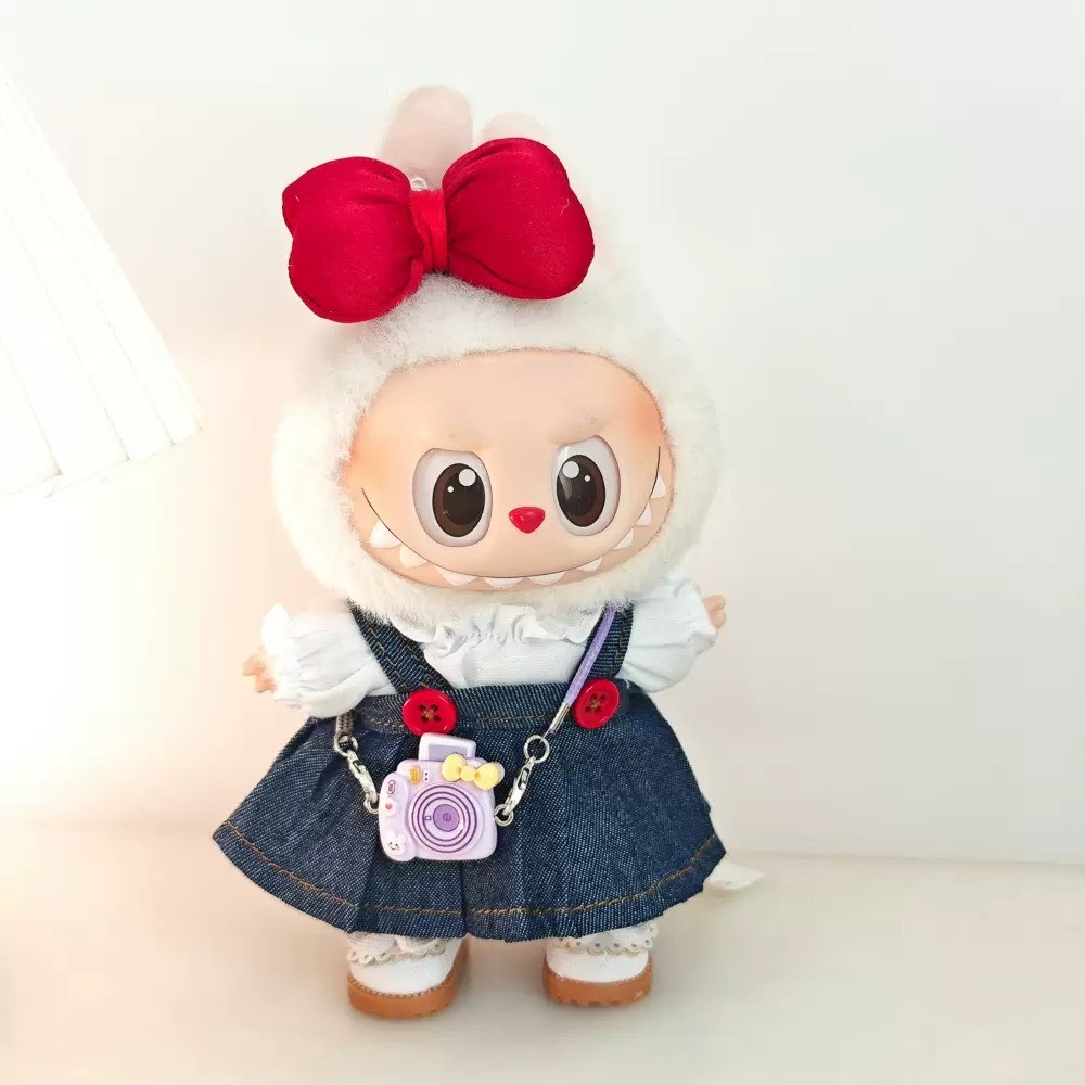 Charming Labubu Doll Outfit: Stylish White Blouse & Denim Skirt with Adorable Headwear