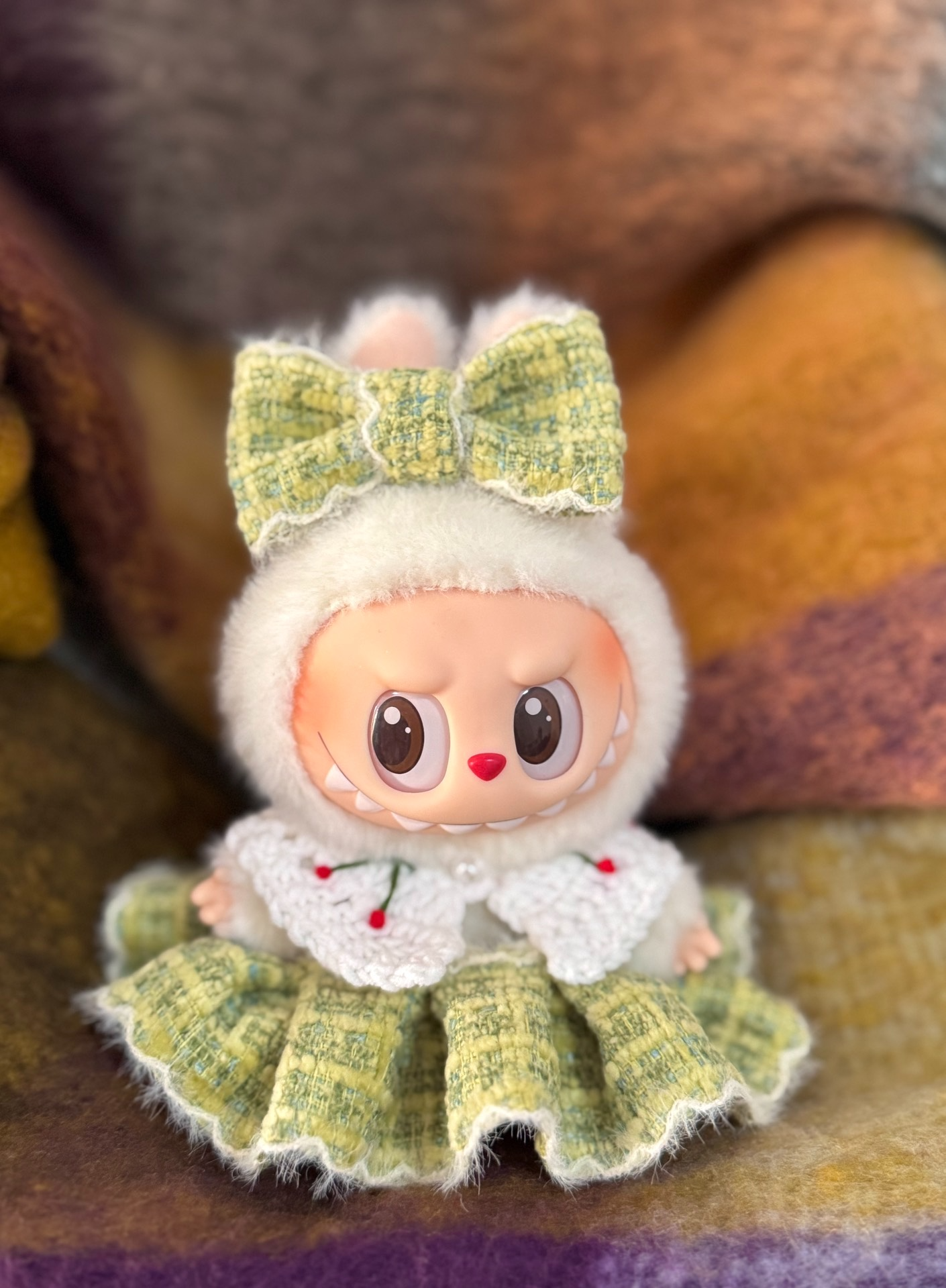 Chic Labubu Doll Dress: Green Shawl Collar with Cherry Bow for Play & Style