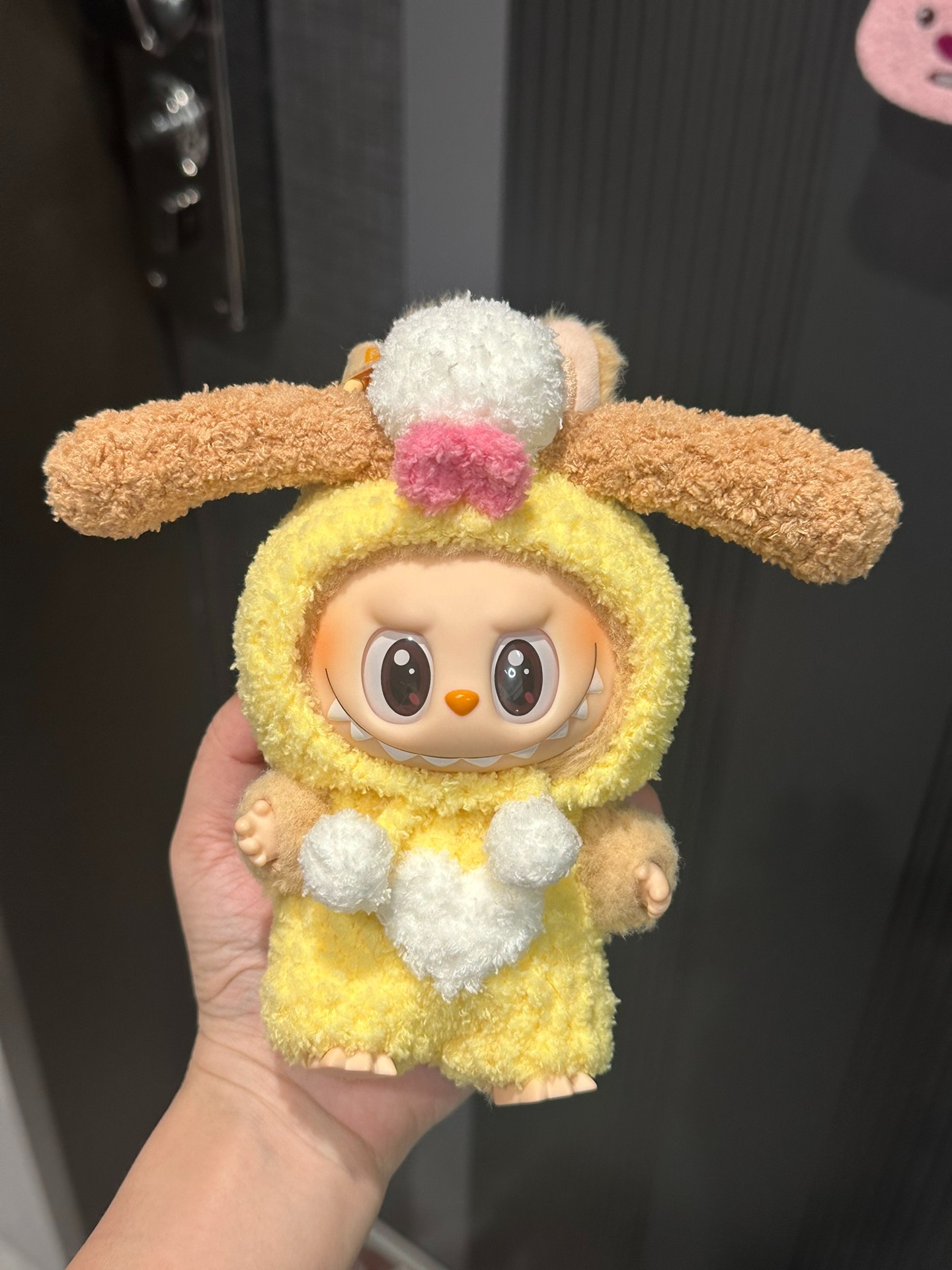 Cozy Bunny Labubu Outfit – Plush Yellow Bodysuit with Fluffy Pom-Poms & Adorable Ears