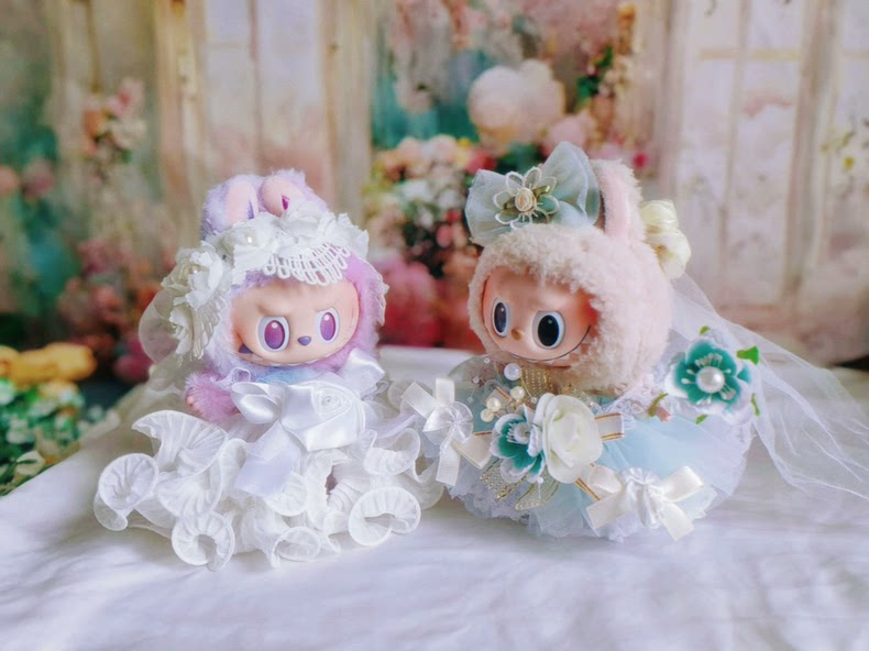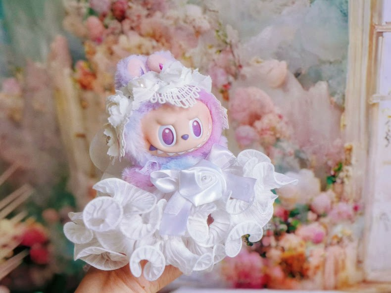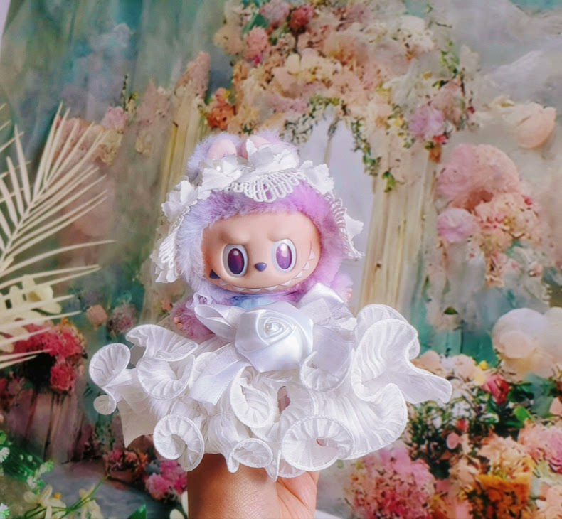 Elegant White Rose LABUBU Bridal Outfit – Delicate Lace & Satin Doll Dress