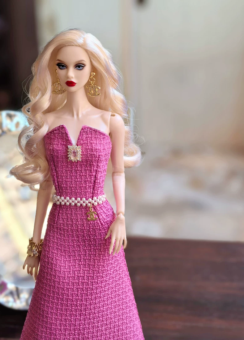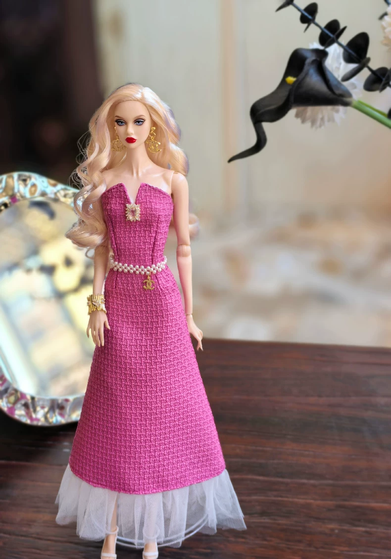 Luxe Pink Tweed Blythe Dress w/ Pearl Waistband & Jewelry Set