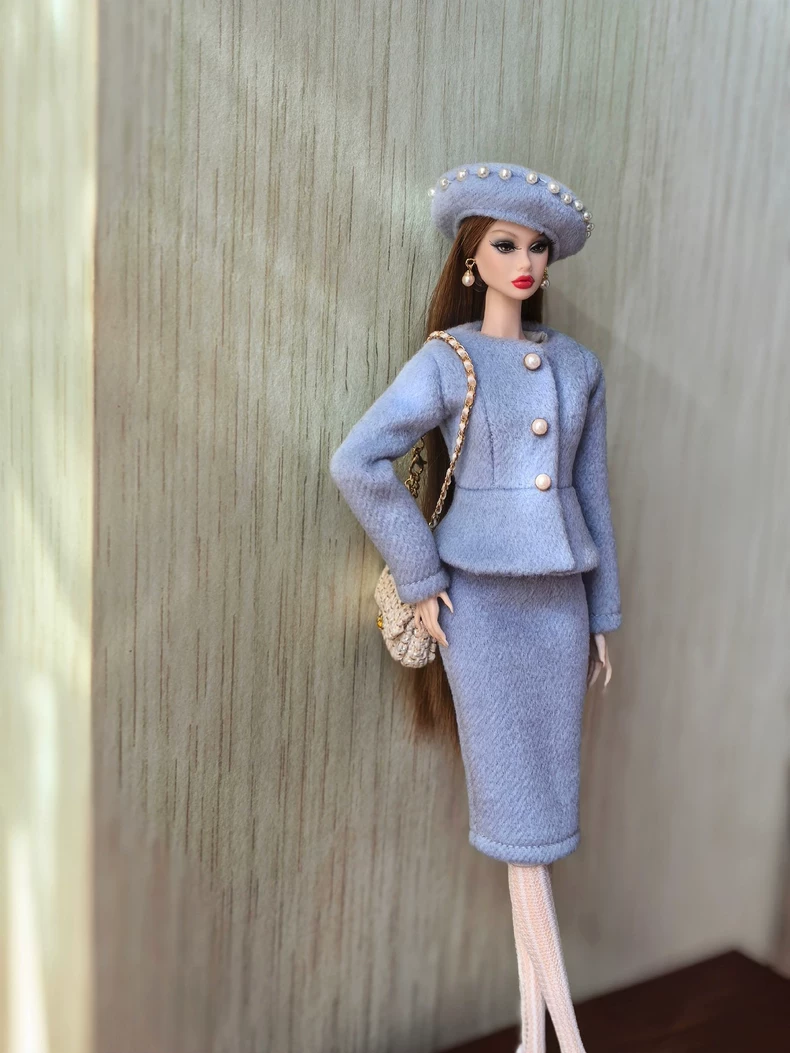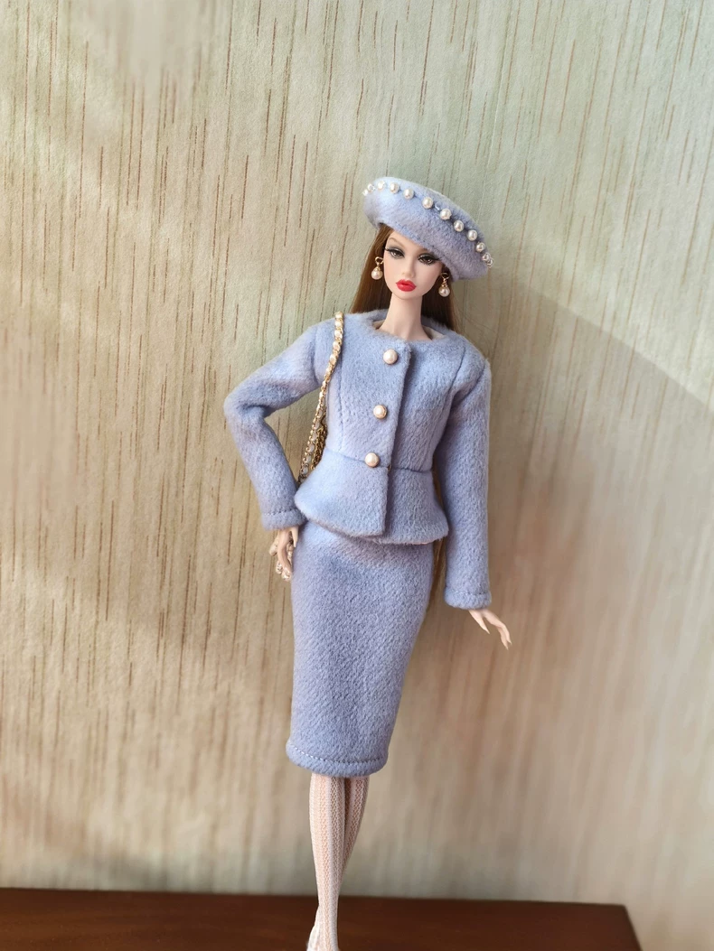 Luxury Baby Blue BJD 1/6 Outfit – Pearl-Adorned Wool Blend Set for Elegant Dolls