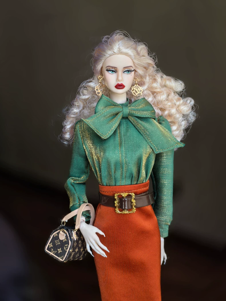 Luxury Grass-Green BJD Doll Outfit Set with Bow & Gold Accents – Premium 1/6 Fashion Ensemble