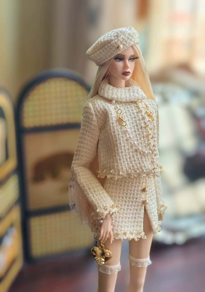 Elegant 1/6 BJD Doll Outfit – Luxe Cream Bouclé Ensemble with Gold Accents & Heart Necklace