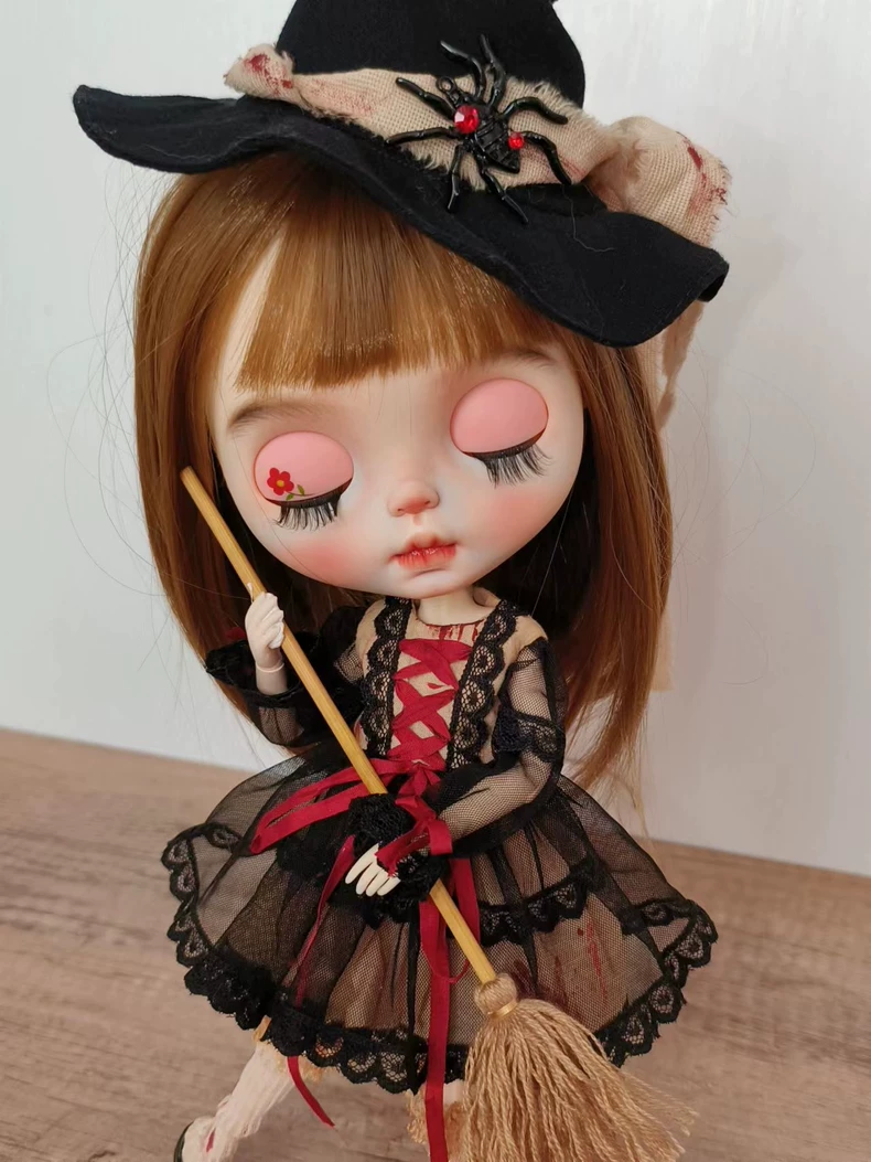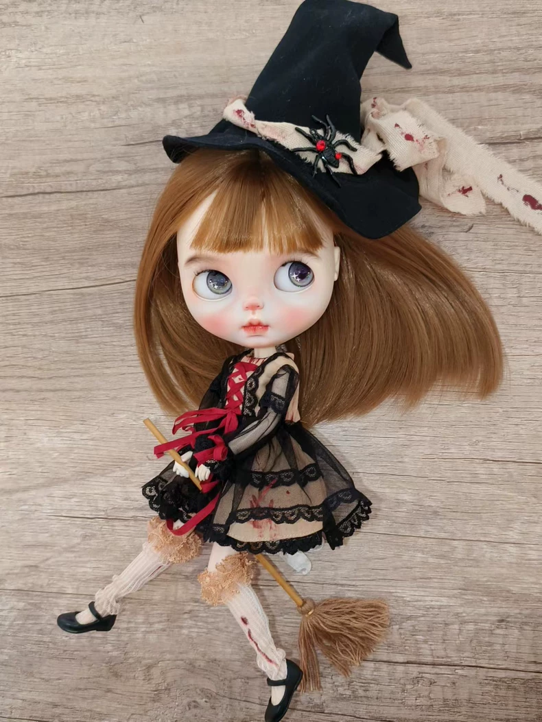 Spooky Chic BLYTHE Witch Costume – Lace & Blood-Splattered Halloween Outfit with Broomstick