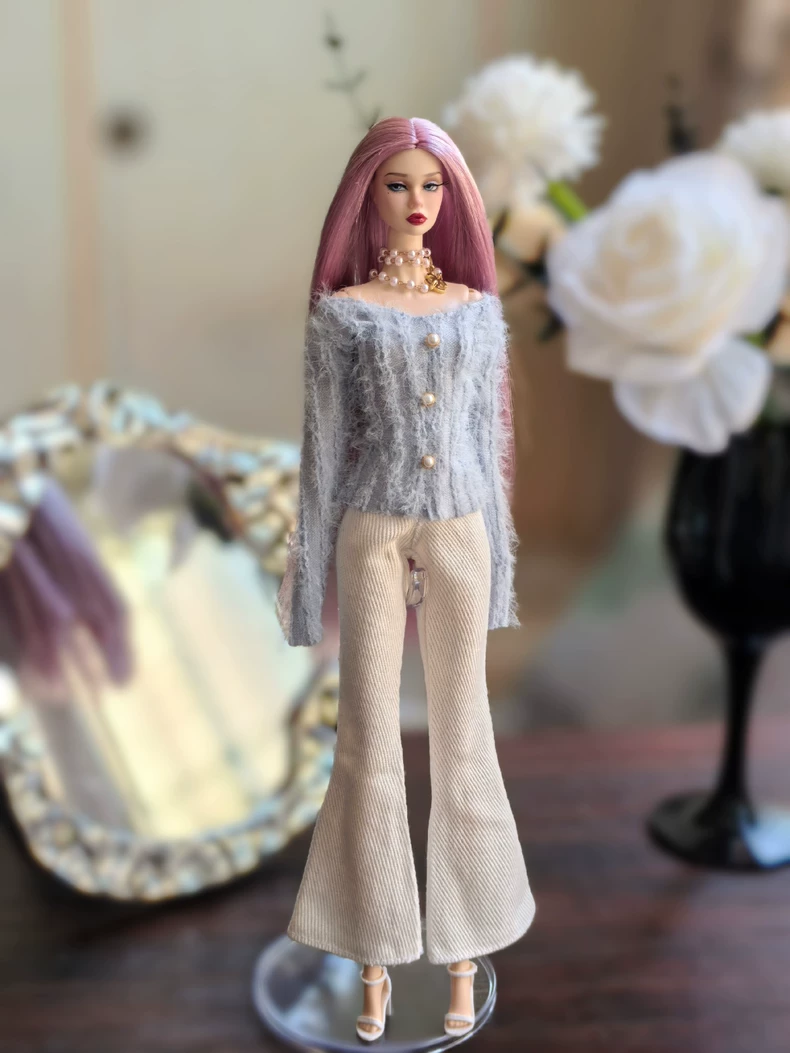 Stylish Baby Blue Fuzzy Sweater & White Flare Pants Outfit for 1/6 BJD Dolls – Elegant & Versatile