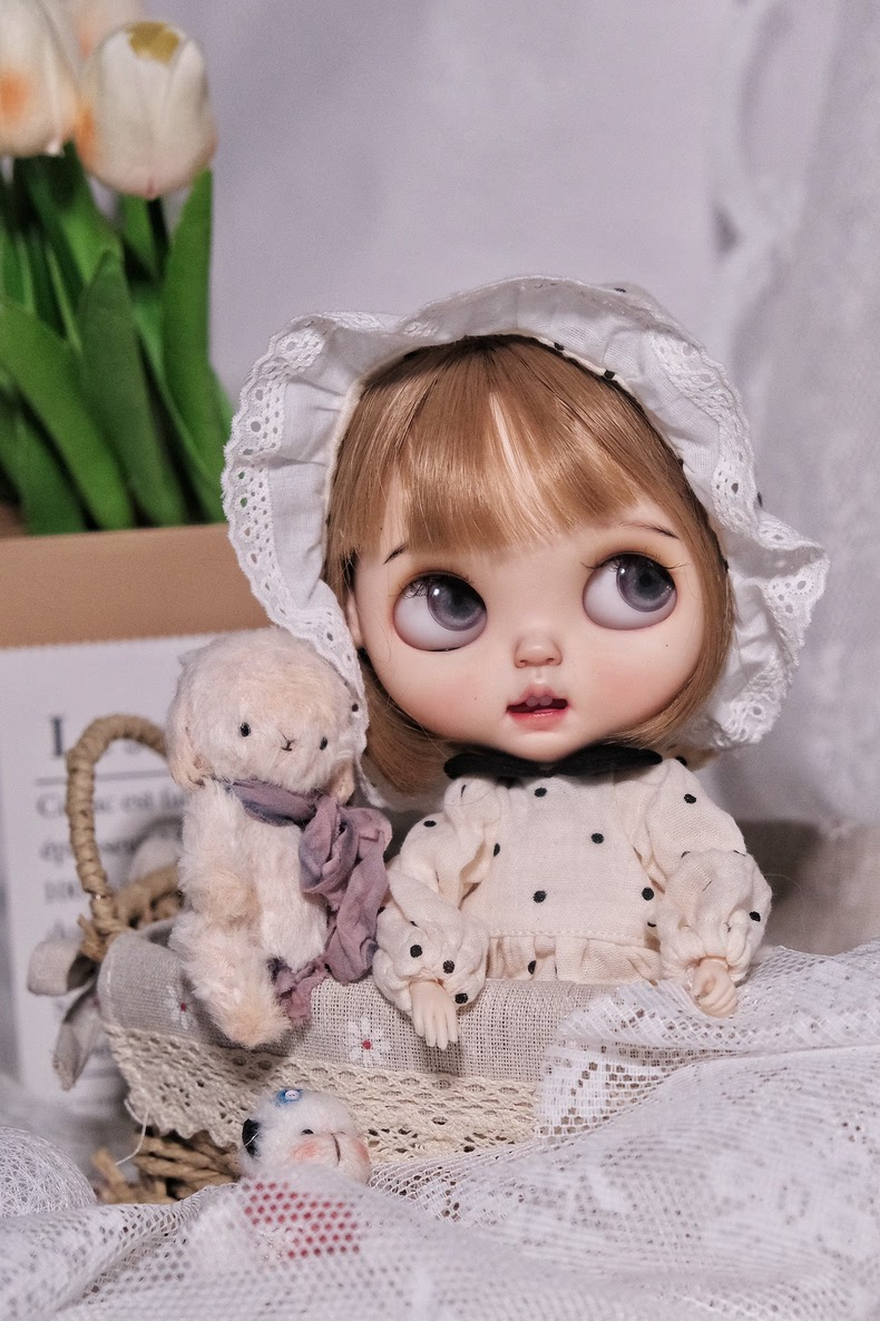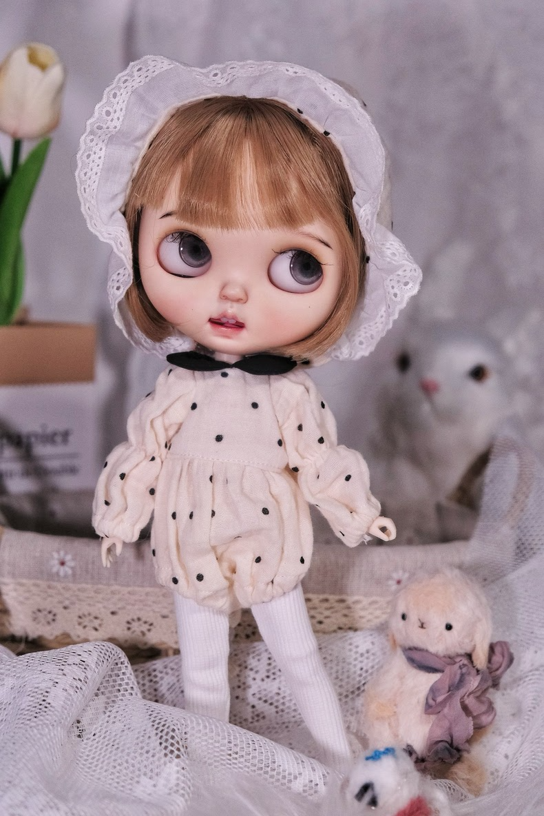 Timeless Cream & Black Polka Dot Blythe Doll Outfit – Elegant Lace Bonnet & High-Quality Cotton Dress for Collectors