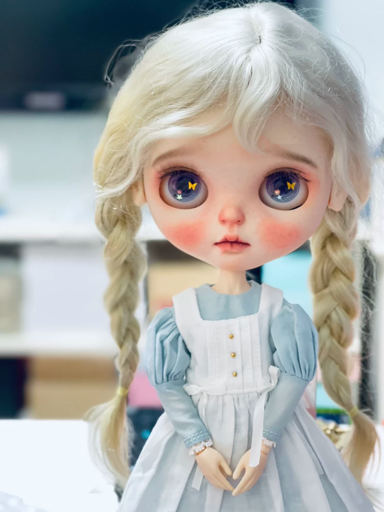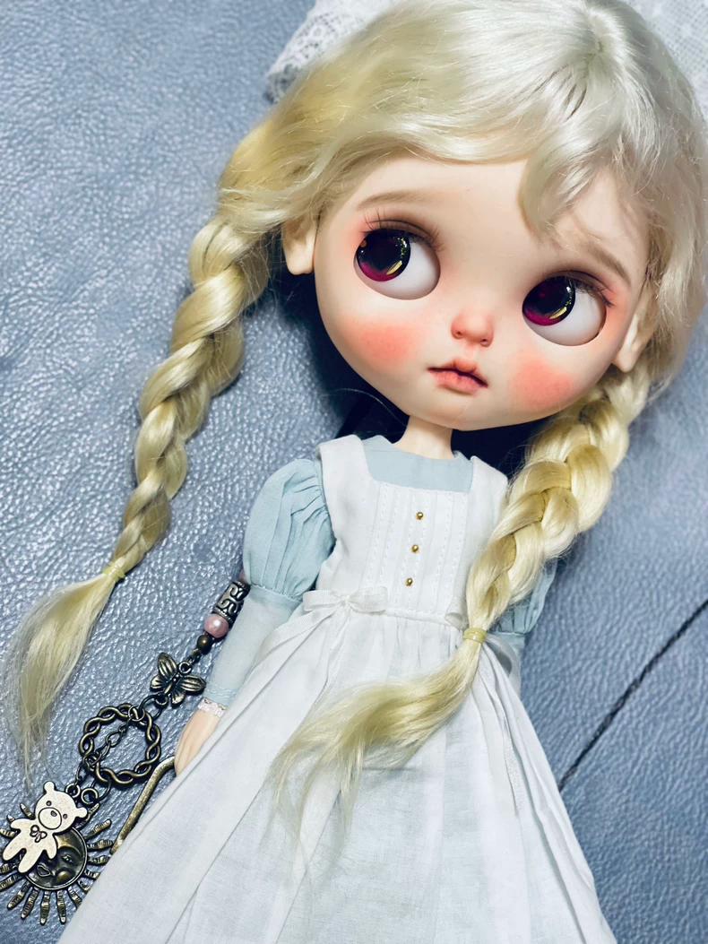 Vintage Blythe Doll Outfit - Handmade Maid Ensemble - Cotton Linen Dress - Pastel Blue/White - Collector Grade Elegance