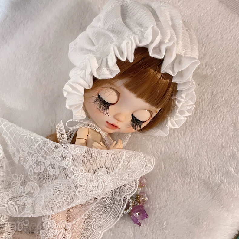 Vintage Lace Blythe Doll Sleep Cap - Soft Plush White Cotton with Adjustable Straps for Collectors