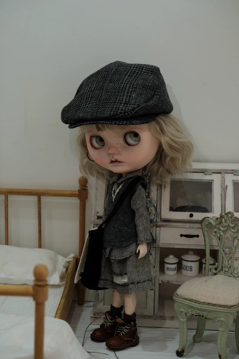 Vintage-Modern Blythe Doll Outfit: Chic Adjustable Layers in Gray Black White - Premium Tweed & Cotton Collector Outfit