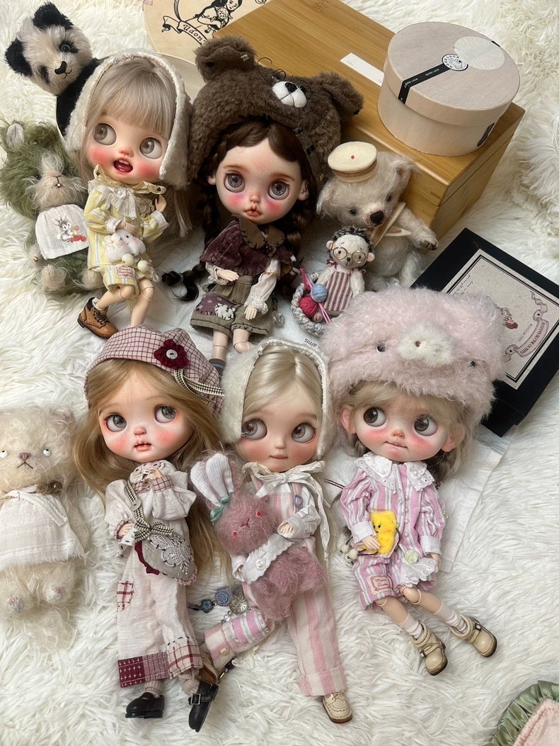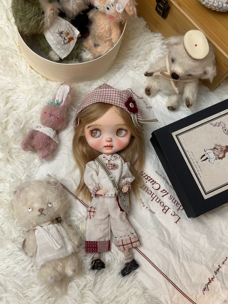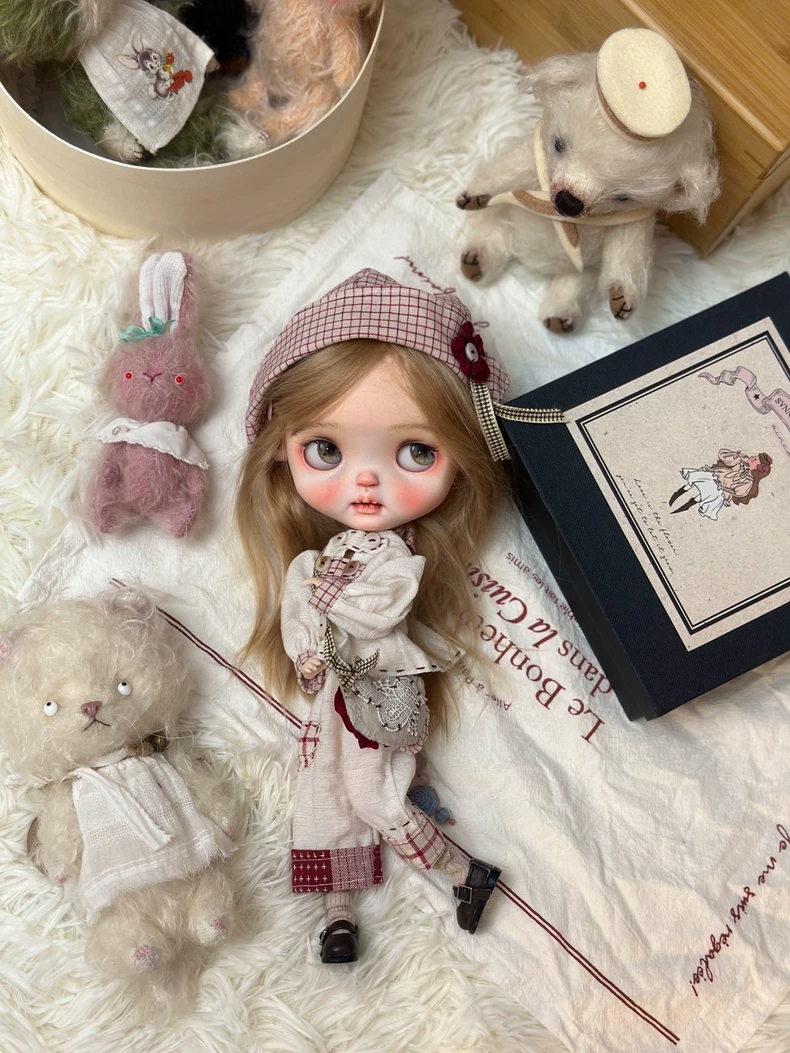 Vintage Navy BLYTHE Doll Outfit – Cream & Red Checkered Ensemble with Hat, Scarf & Accessories