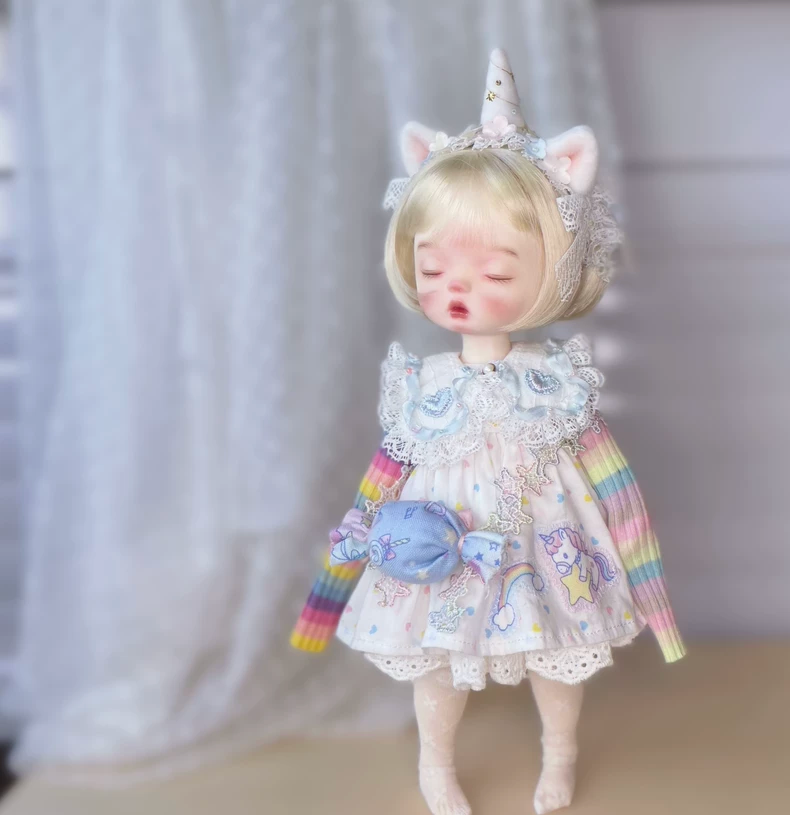 Whimsical Unicorn Blythe Doll Outfit: Rainbow Dress, Lace Headband & Playful Purse